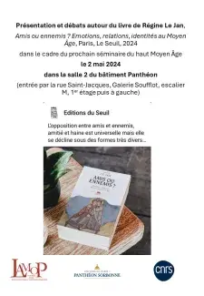 Venez assister à la présentation et aux débats autour du livre de Régine Le Jan, Amis ou ennemis ? Emotions, relations, identités au Moyen Âge, qui se dérouleront dans le cadre du prochain séminaire du haut Moyen Âge le jeudi 2 mai de 15 h à 17 h 30 au centre Panthéon.