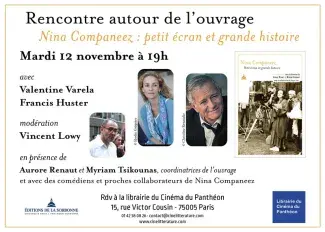 Les Éditions de la Sorbonne et la librairie du Cinéma du Panthéon ont le plaisir de vous proposer une rencontre autour de l'ouvrage Nina Companeez, Petit écran et grande histoire, le mardi 12 novembre à 19 h, avec Valentine Varela et Francis Huster, ainsi que les principaux comédiens et proches collaborateurs de Nina Companeez, et en présence d'Aurore Renaut et Myriam Tsikounas, coordinatrices de l'ouvrage.
